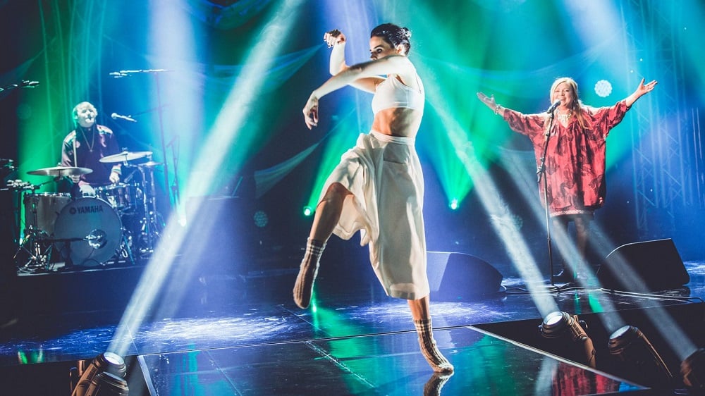 Her fra en opptreden på NRK under TV-aksjonen 2015. Simone danser i finskjørt og ullsokker – et antrekk som illustrerer den kontrastfylte sommeren i Nord-Norge. Første gang brukt under forestillingen «Northern Soul» som hun laget til Varangerfestivalen 2014 sammen med ektemannen Herman Rundberg. Med på bildet og fremføringen er også Mari Boine. Foto: Jonas Jeremiassen Tomter